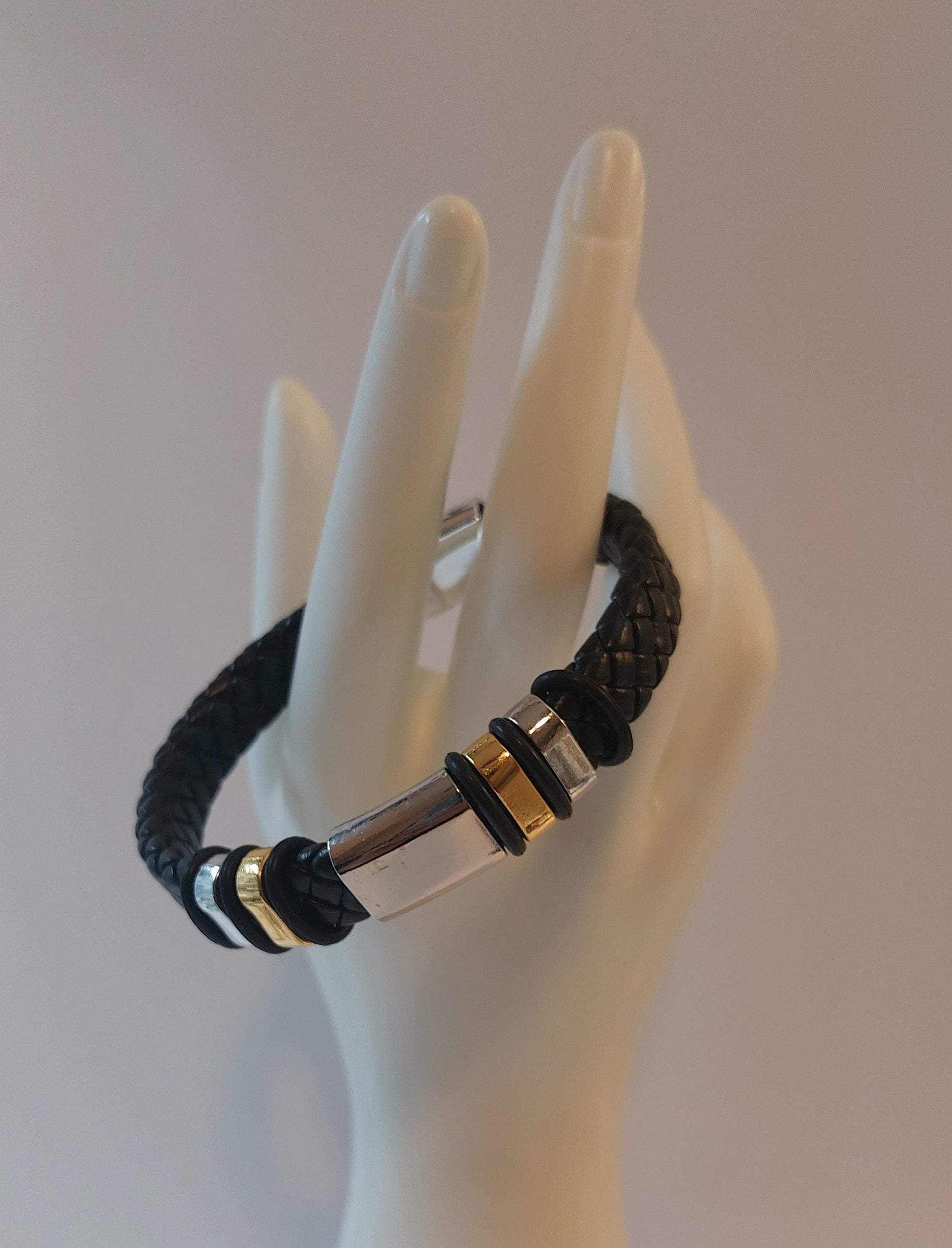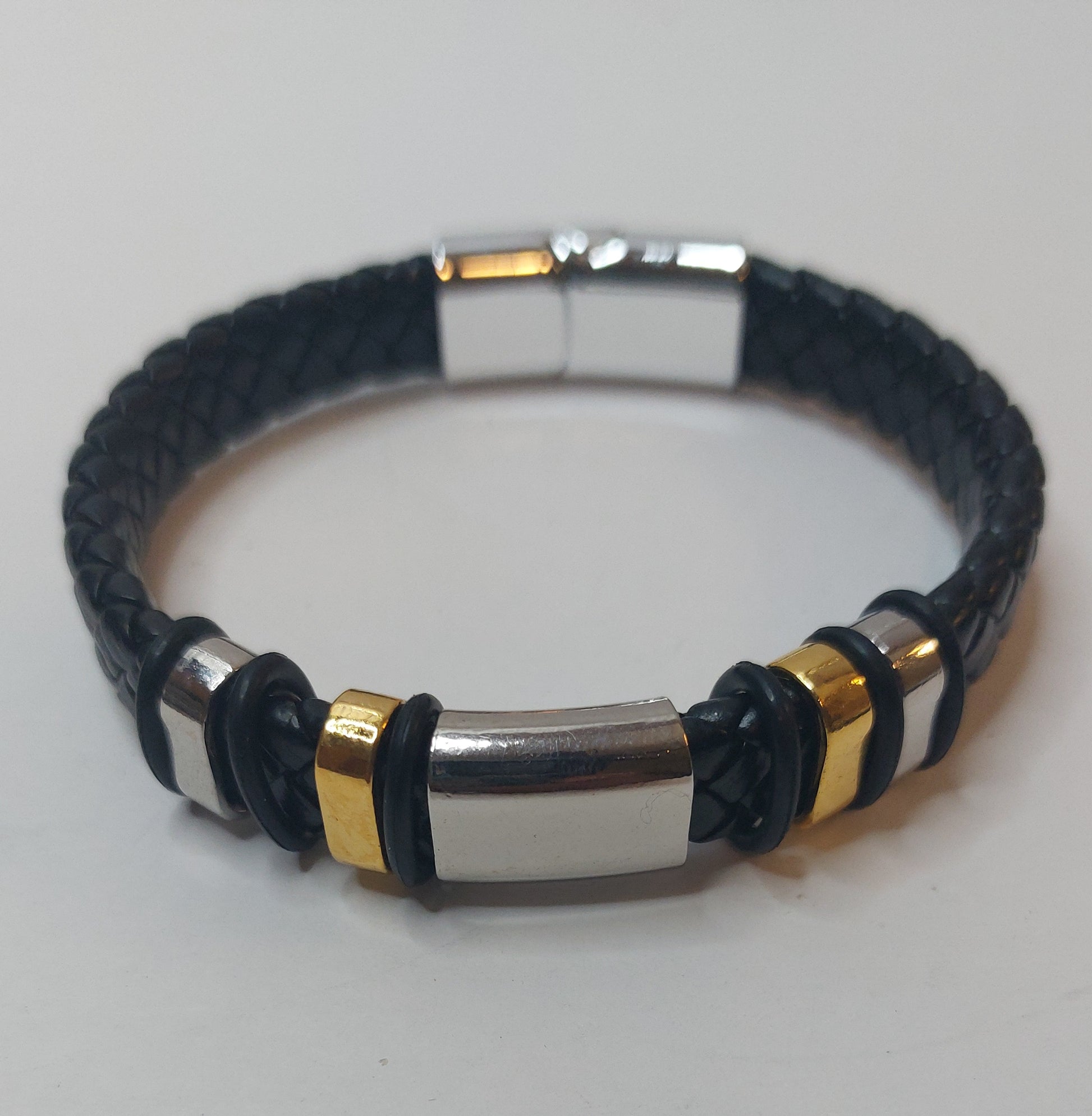 Elevate your style with our unisex bracelets for men and women. This stunning bracelet feature a variety of sleek black and silver metallic metal spacers on leather cording.