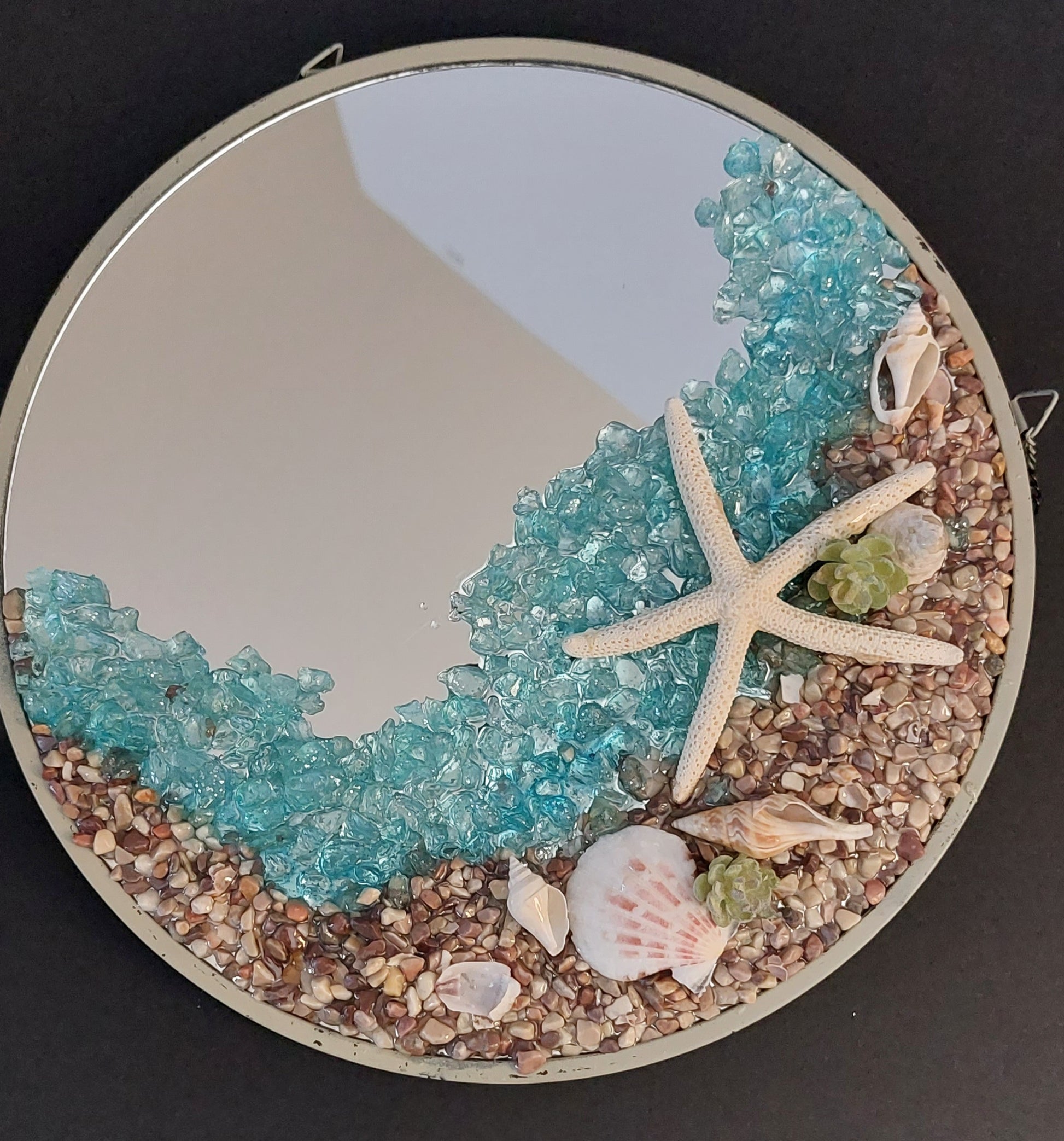 Elevate your home decor with our unique art pieces. This picture features a serene sea scape with delicate shells, light blue crushed glass for the waves, decorated with a real star fish, pebbles, on round mirror glass with resin overlay. Transform your space into a luxurious oasis with this exquisite art piece.