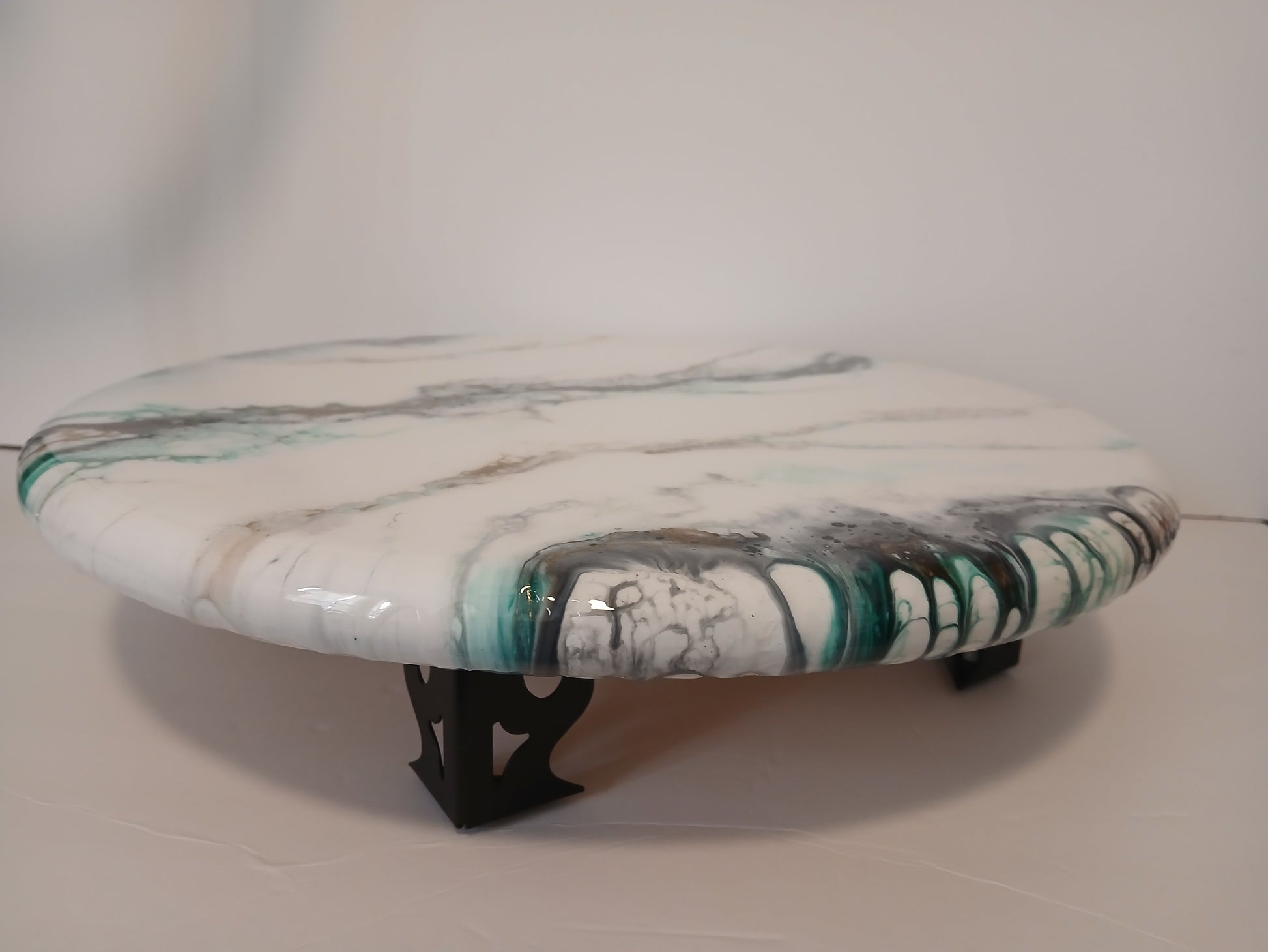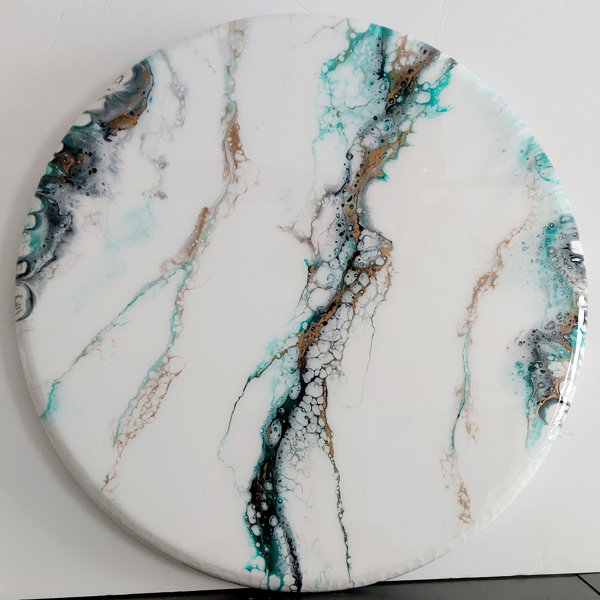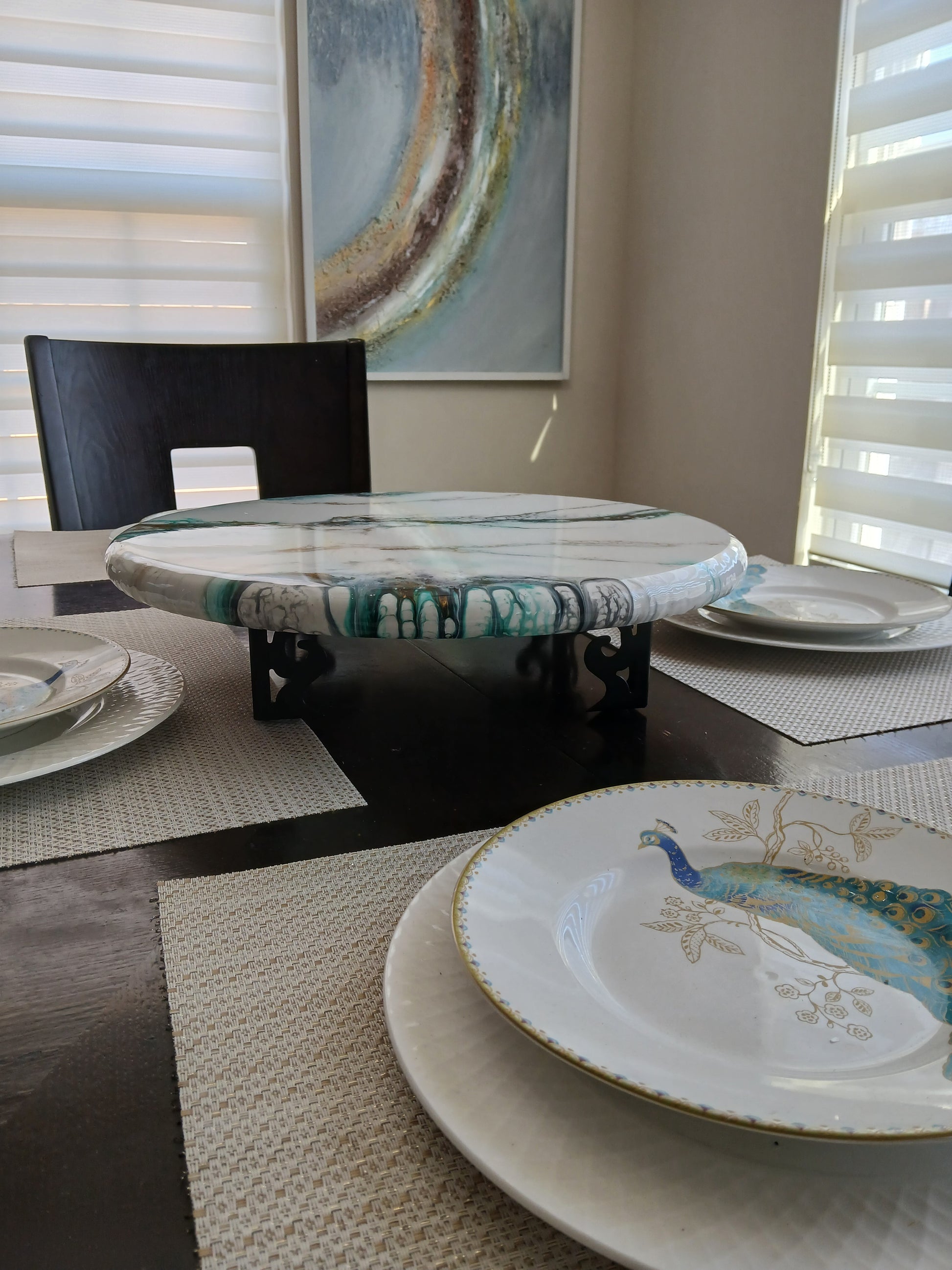 Handcrafted using a 18" wooden round and a hand-painted design using luxurious resin and acrylic paint, this statement piece adds unparalleled style to any home. Elevate your hosting game with our one-of-a-kind and exclusive collection.