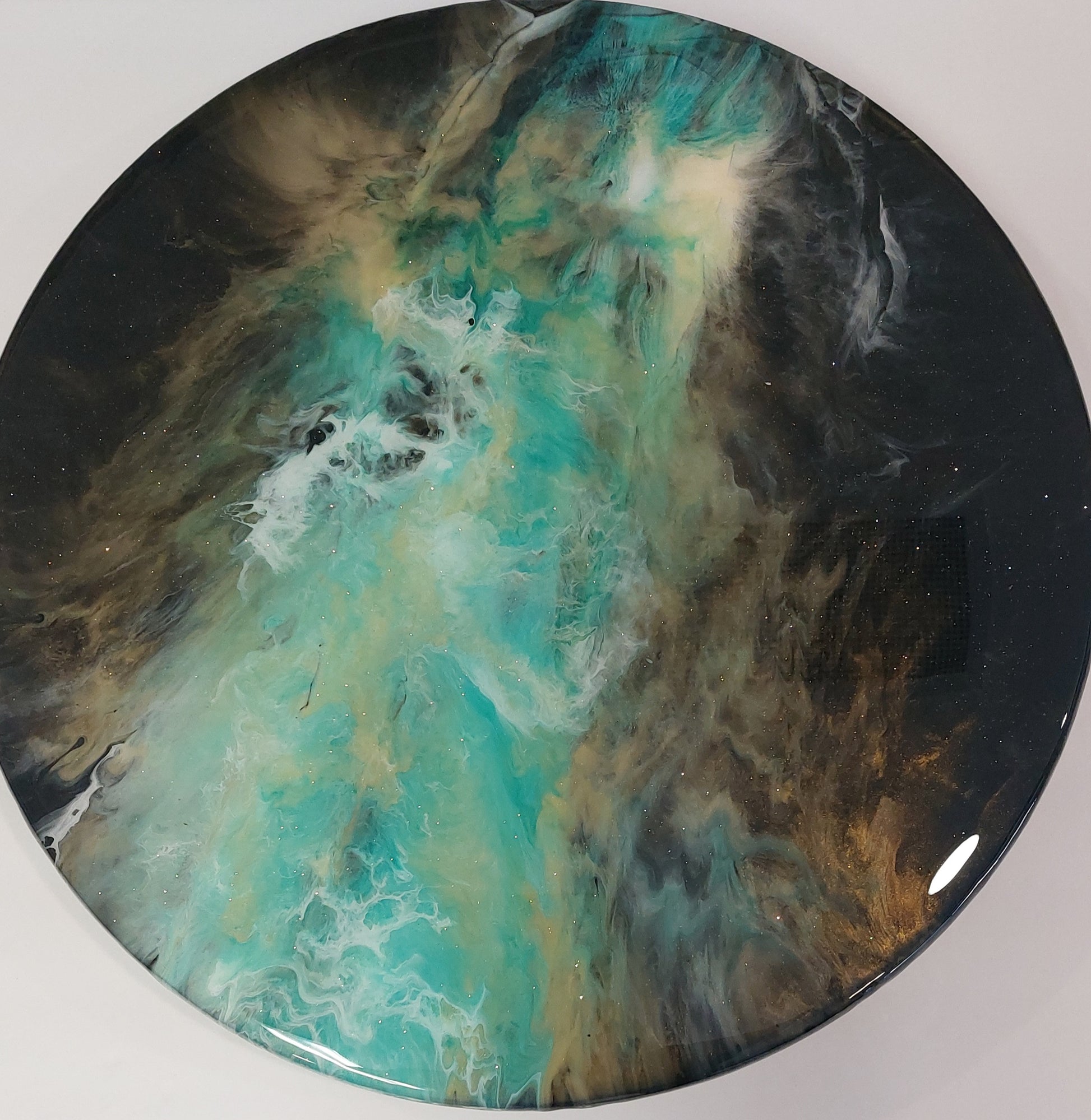 Handcrafted using 18" wooden rounds and adorned with hand-painted designs using luxurious resin and acrylic paint, these statement pieces add unparalleled style to any home. Elevate your hosting game with our one-of-a-kind and exclusive collection.