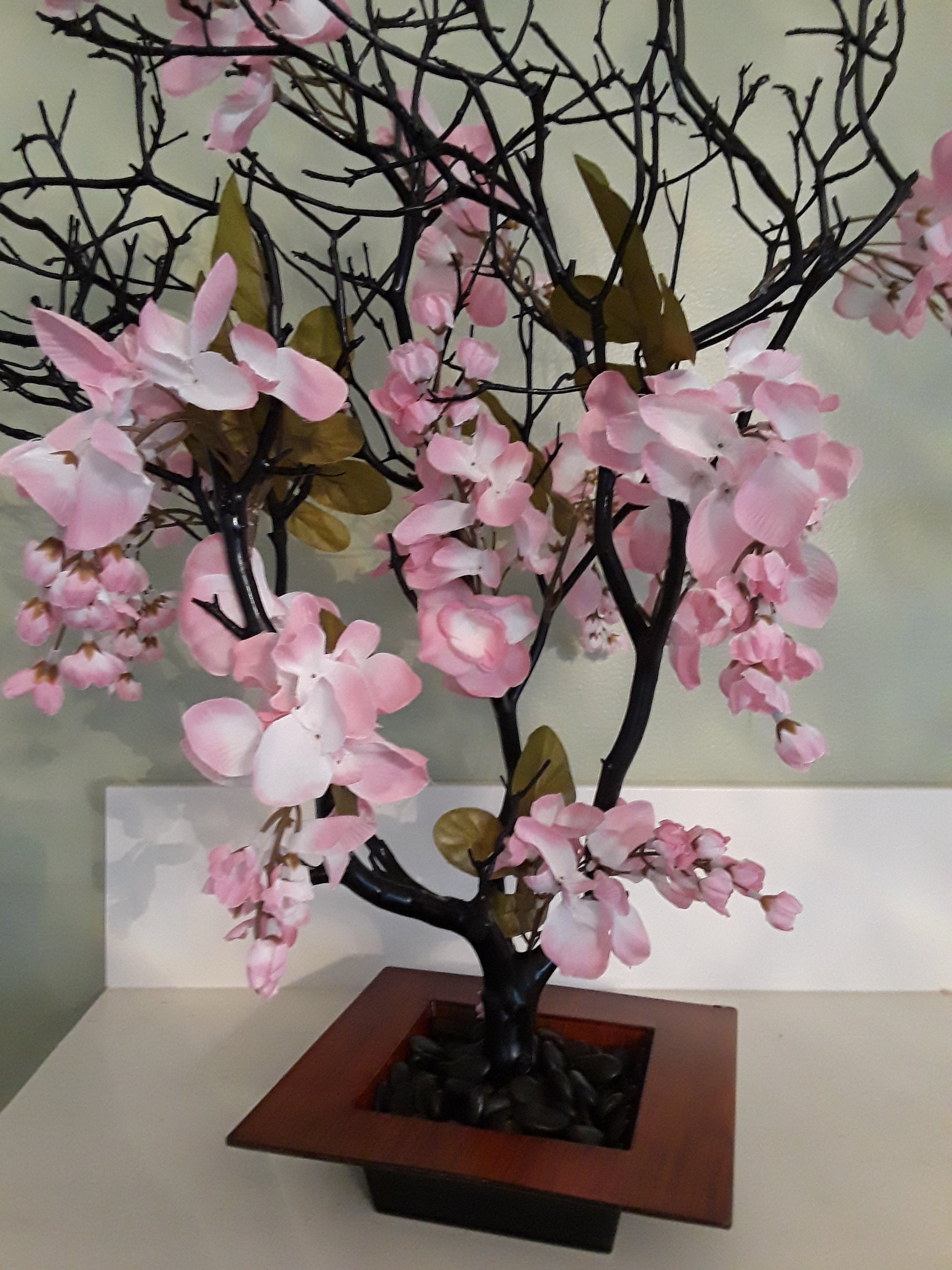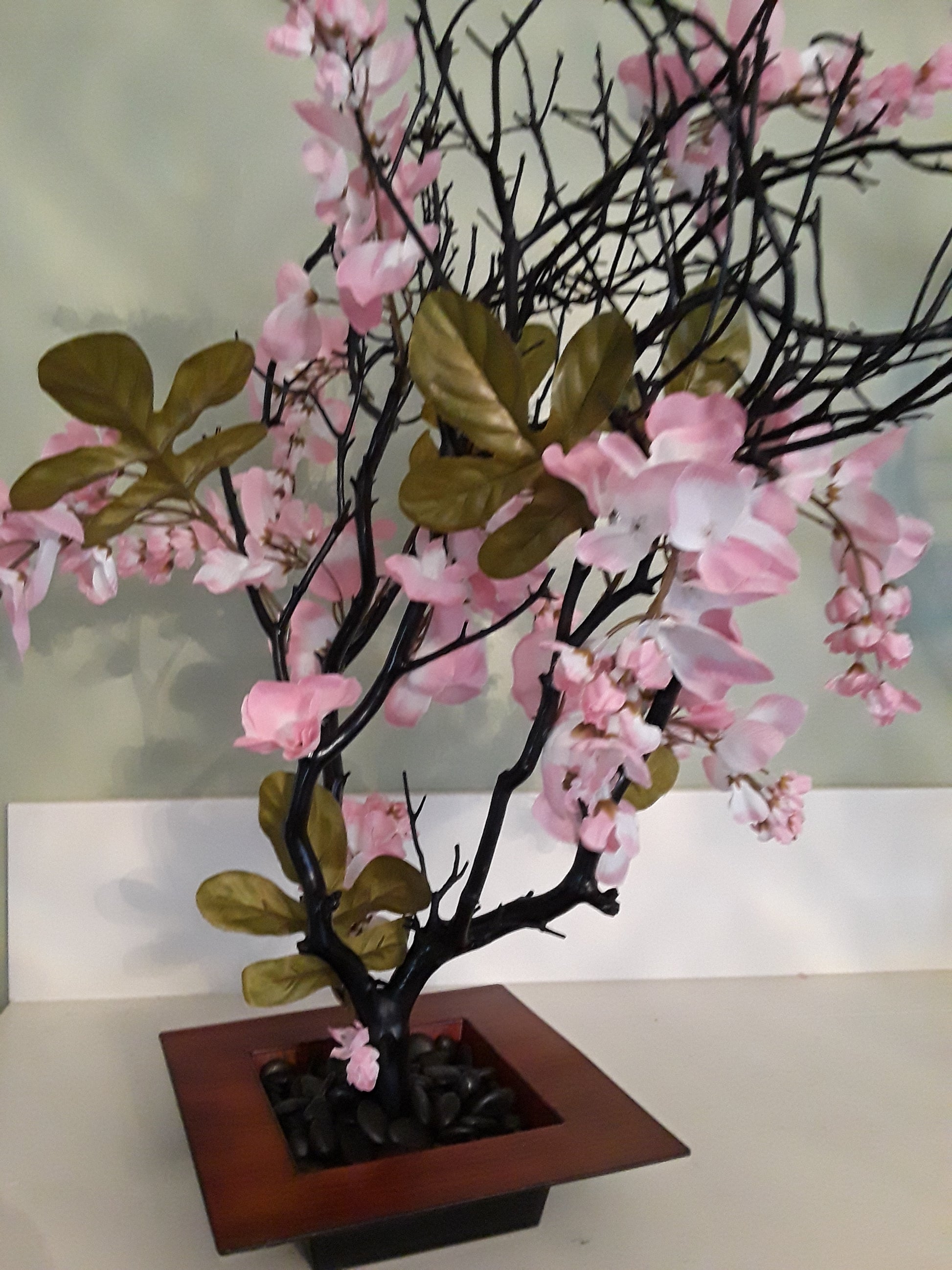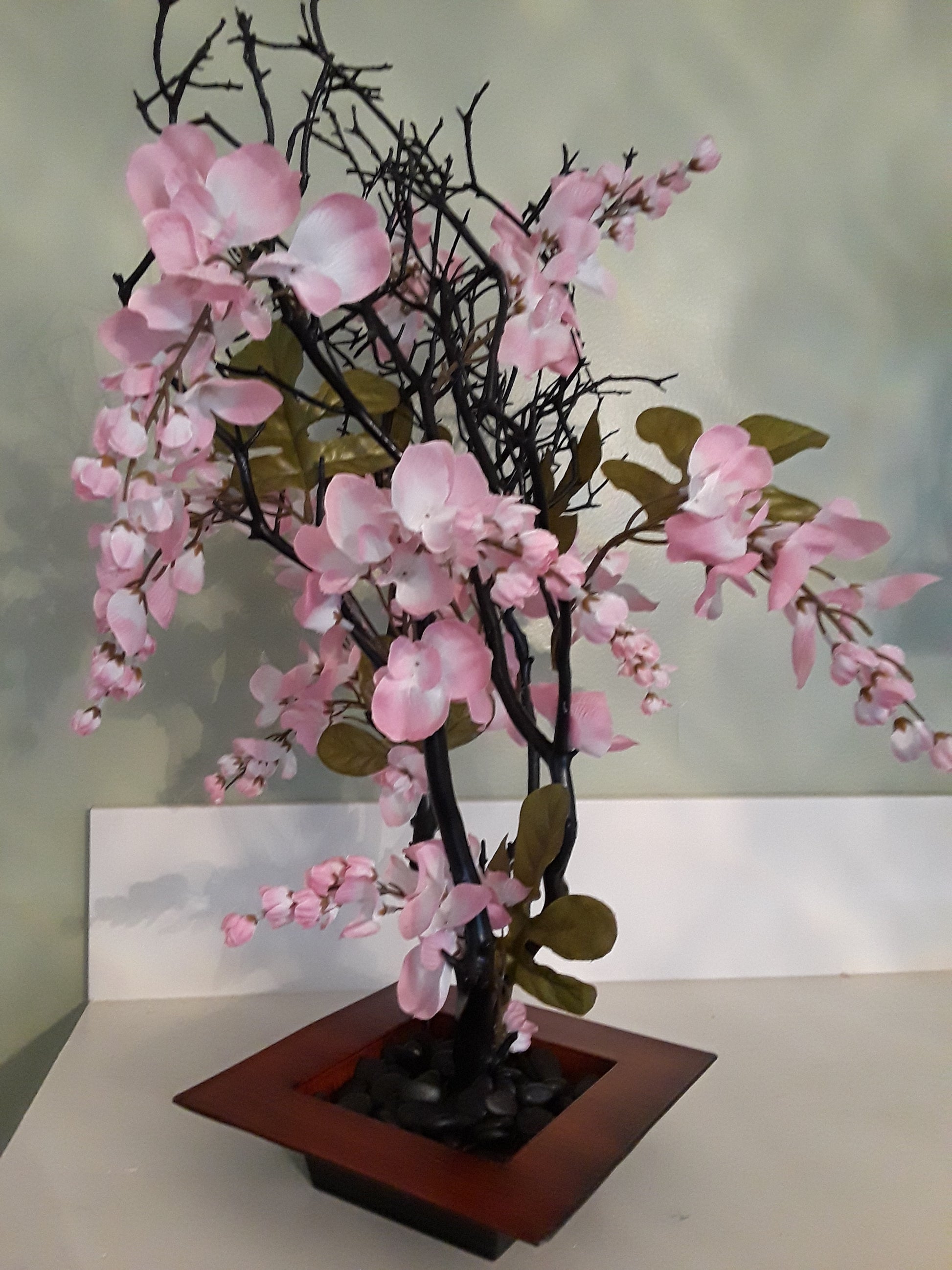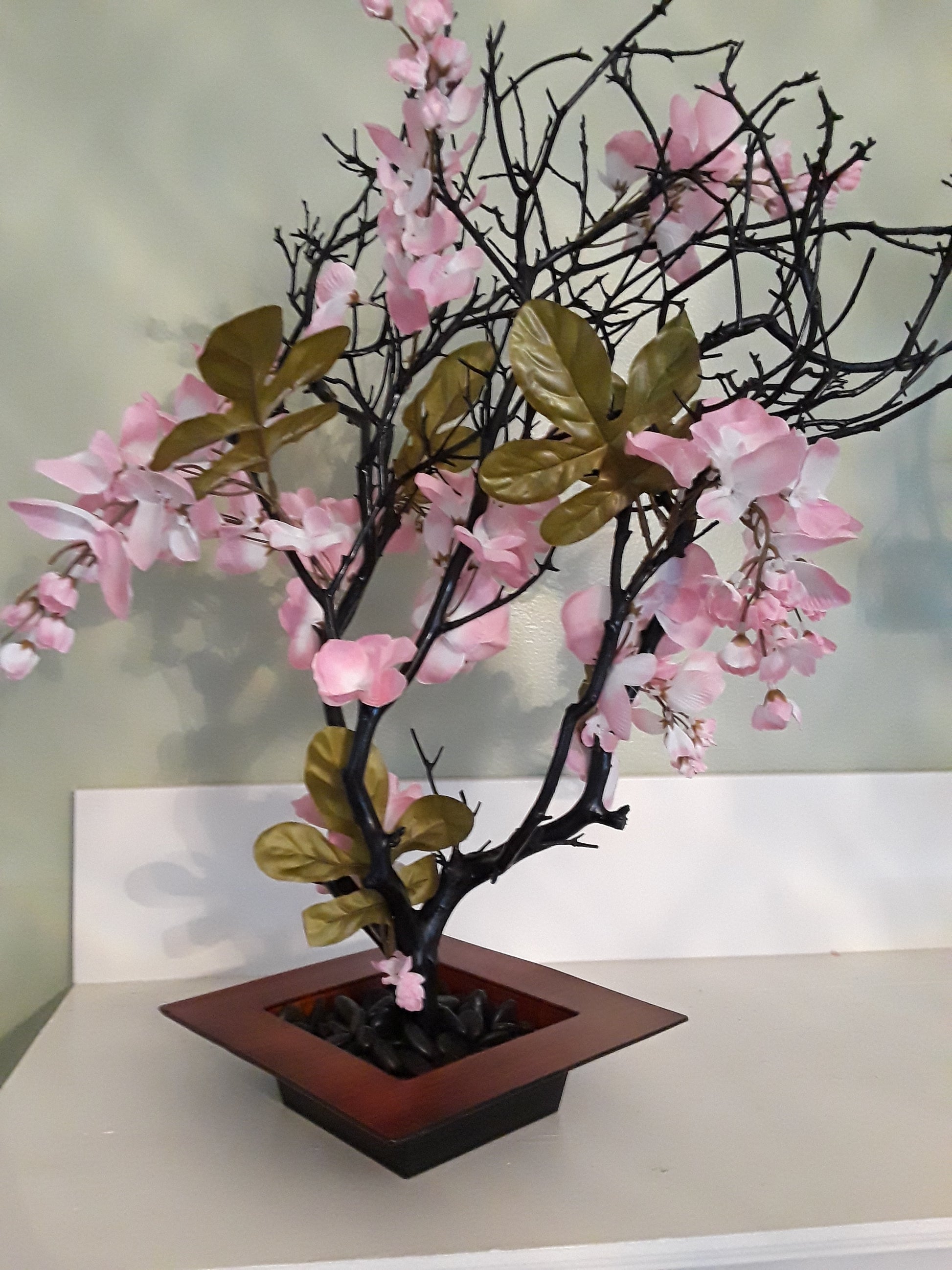 "Add a touch of elegance to your home decor with our unique natural Manzanita branch adorned with beautiful pink artificial silk flowers. Paired with a Japanese vase, this one-of-a-kind piece is sure to impress and beautify any space. Bring a little bit of nature indoors with this beautiful and stunning decoration."