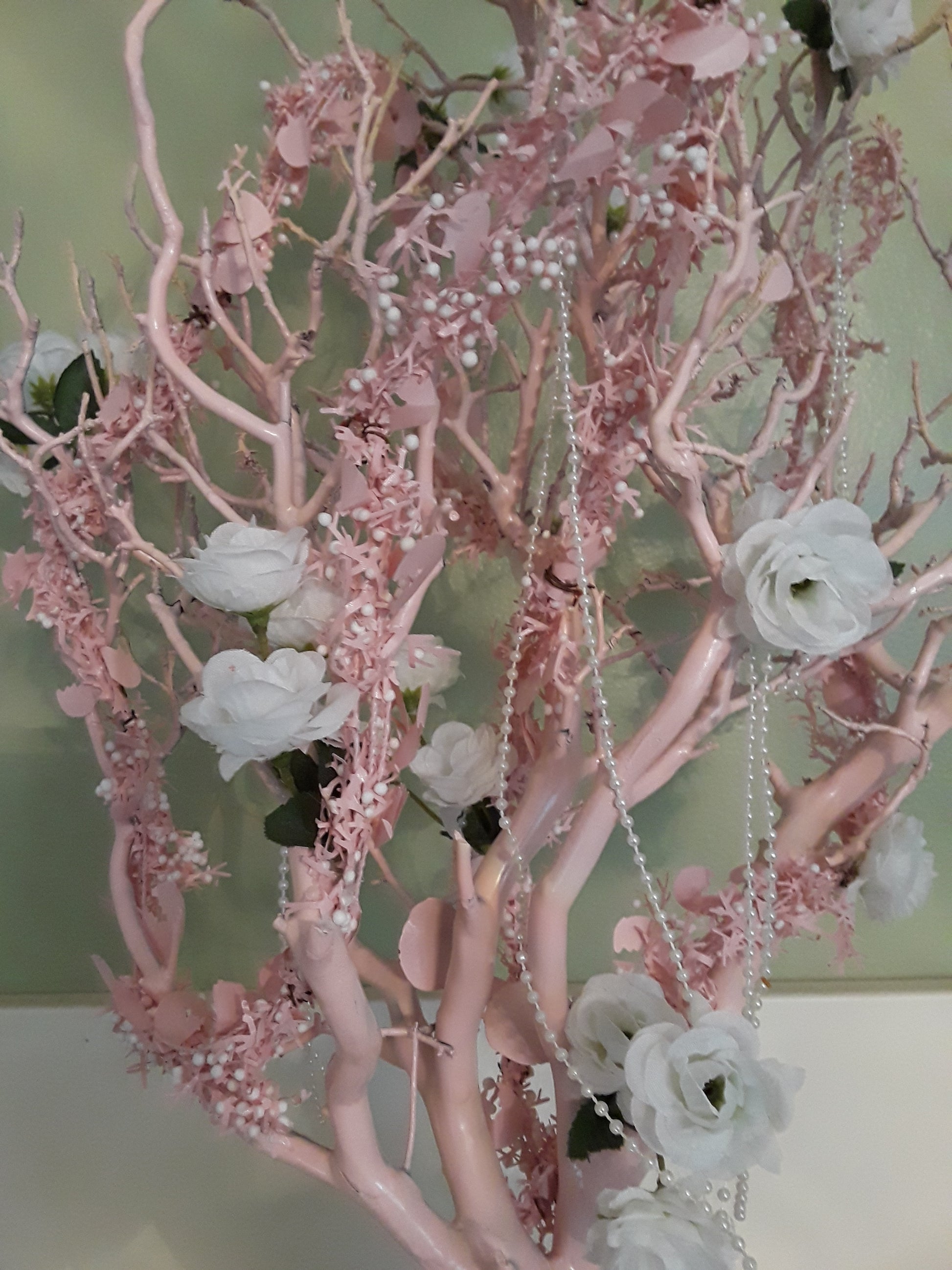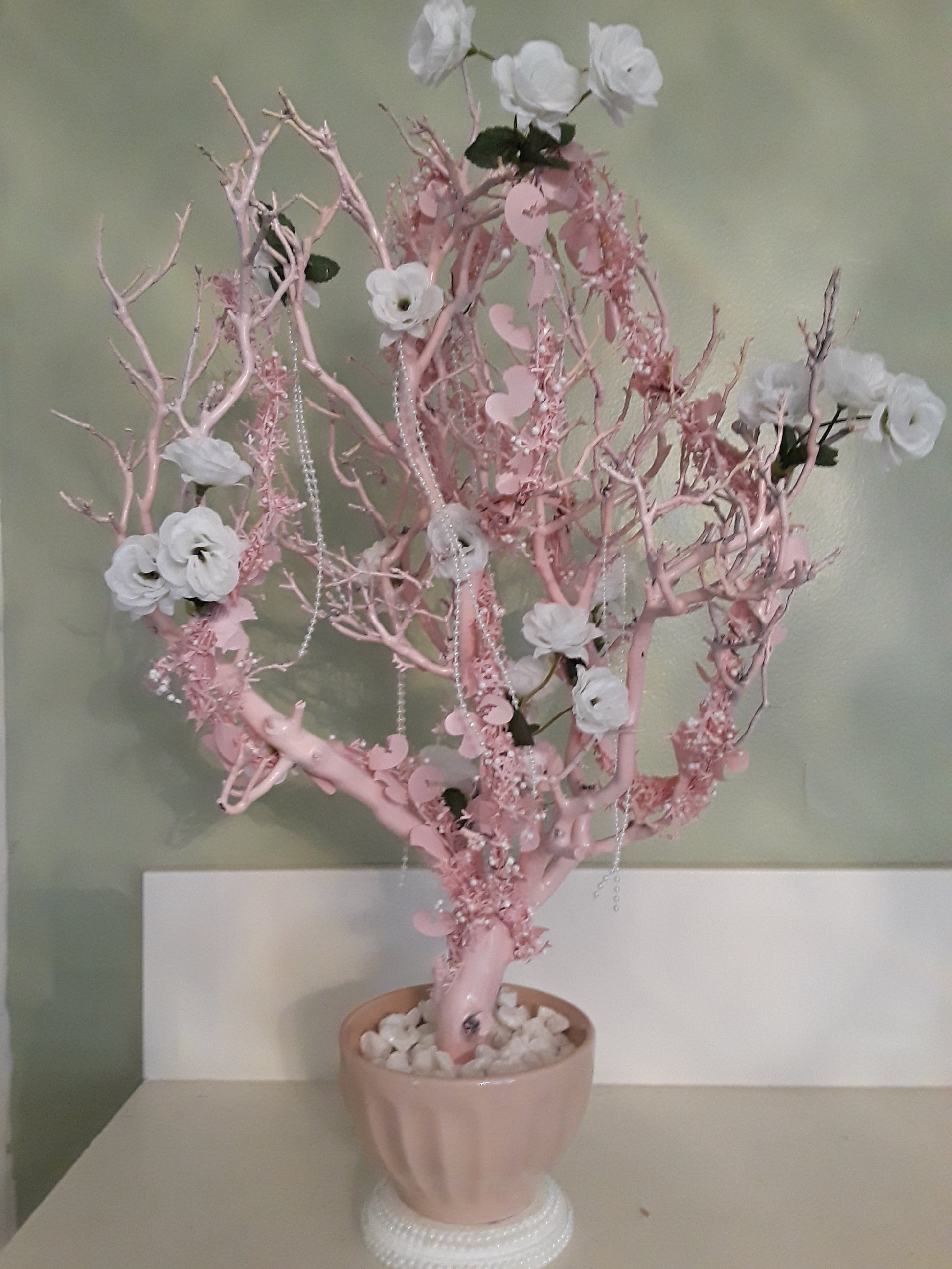 "Add a touch of elegance to your home decor with our unique natural Manzanita branch adorned with beautiful pink artificial silk flowers. Paired with a round vase on a pearl embellished base, this one-of-a-kind piece is sure to impress and beautify any space. Bring a little bit of nature indoors with this beautiful and stunning decoration."