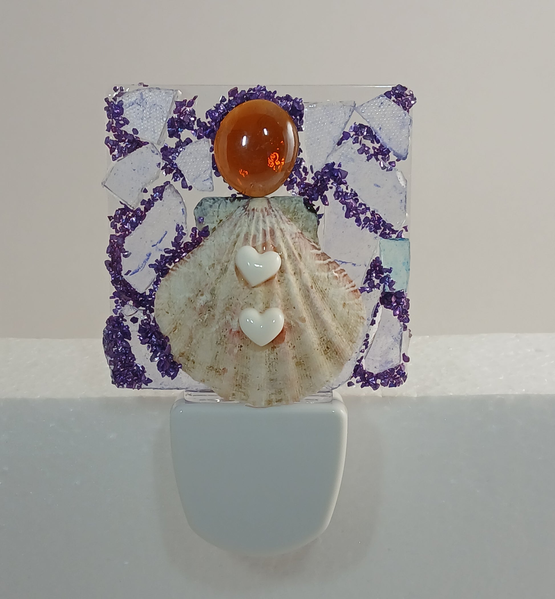 Brighten up your room with NIGHTLIGHT! This whimsical LED night light features a charming angel, made with shells, amber glass, and glitter. Perfect for guest or child's rooms, add a touch of fairy-like magic to your space. Plug it in and let it shine!