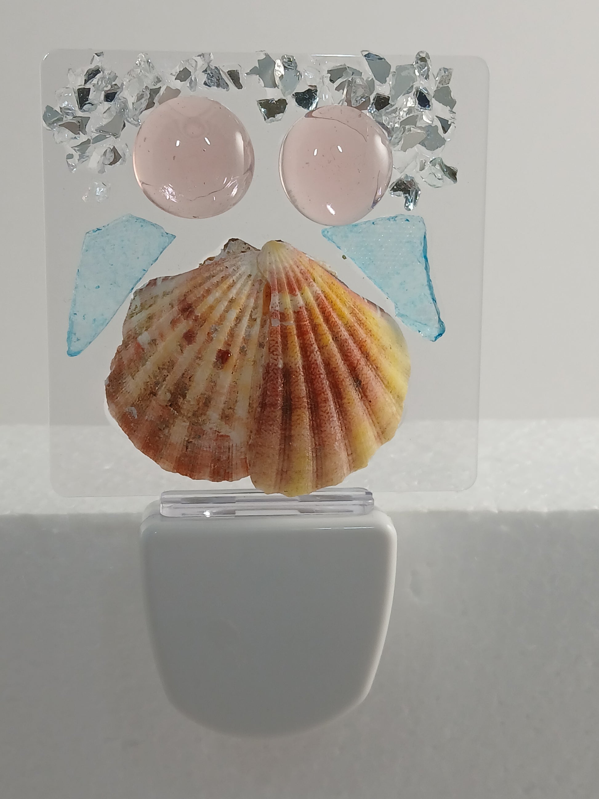 Brighten up your room with NIGHTLIGHT! This whimsical LED night light features charming angels, made with shells, clear glass, sea glass, and crushed glass. Perfect for guest or child's rooms, add a touch of fairy-like magic to your space. Plug it in and let it shine!