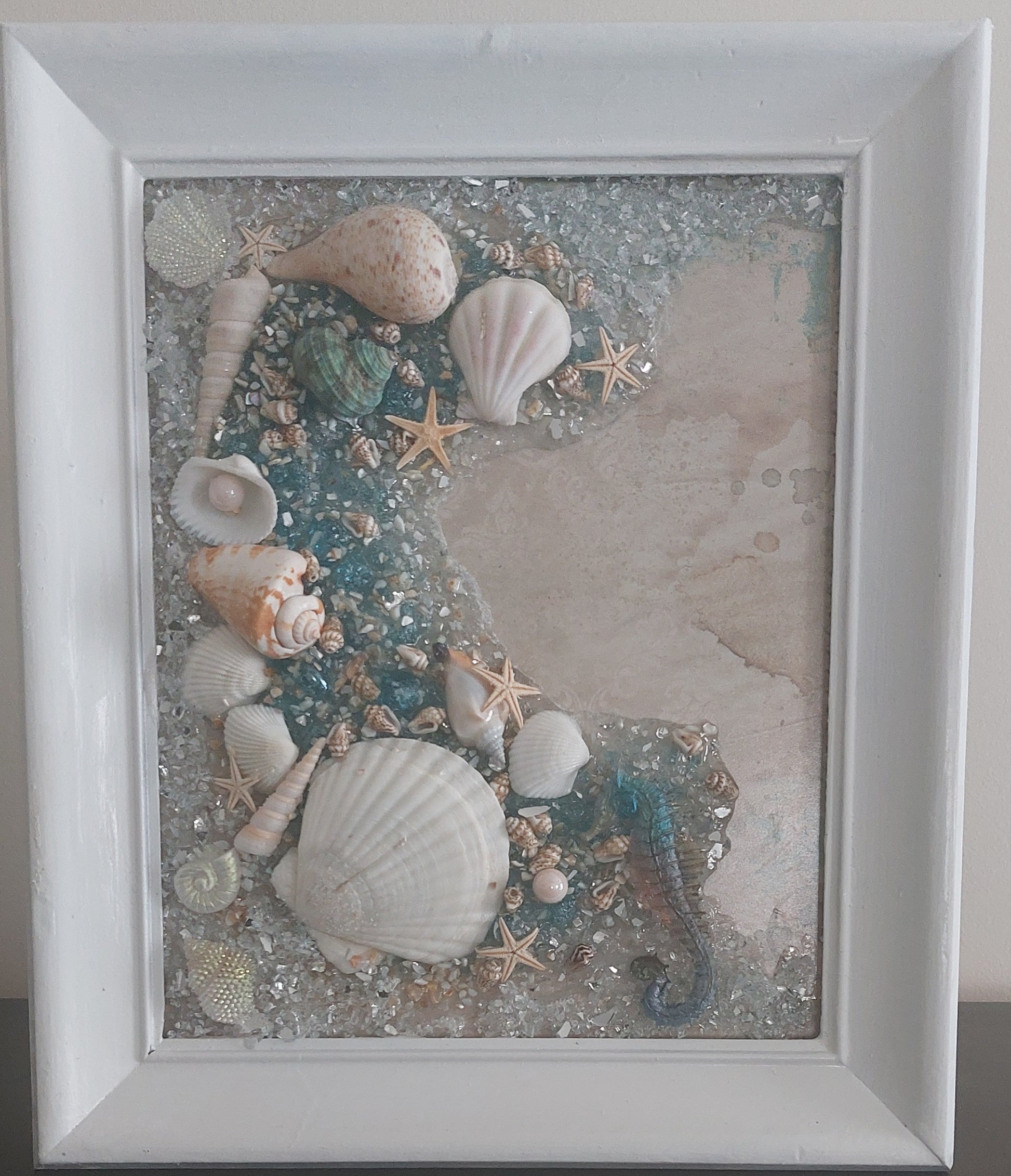 Transform a space in your home with this one-of-a-kind work of art with our Unique Decor Art Pieces. Featuring a mesmerizing seascape adorned with real shells and tumbled blue and white glass. This piece is further enhanced with a resin overlay. Elevate your home decor with this stunning and exclusive addition.