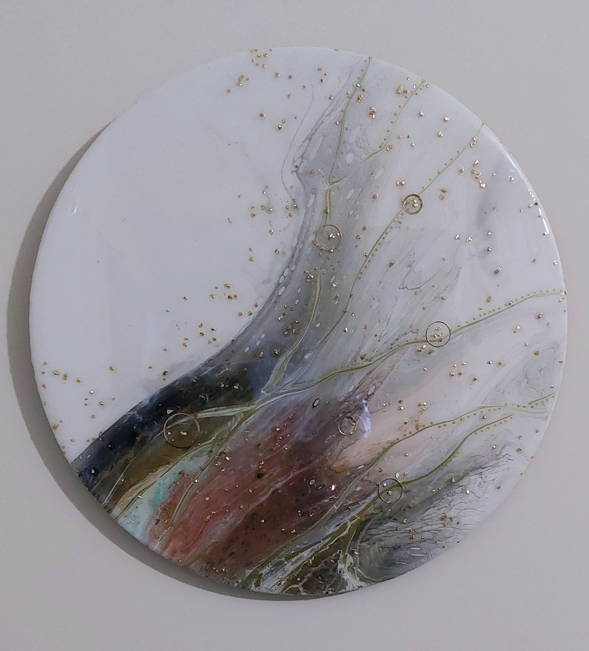 This 18" wall art features delicate, wave-like movements in soothing shades of gray, blue, deep coral and accented with shimmering gold flakes. Its elegant design evokes a serene oceanic atmosphere, inviting a sense of calm and tranquility into any space. Perfect for adding a sophisticated touch to your décor.