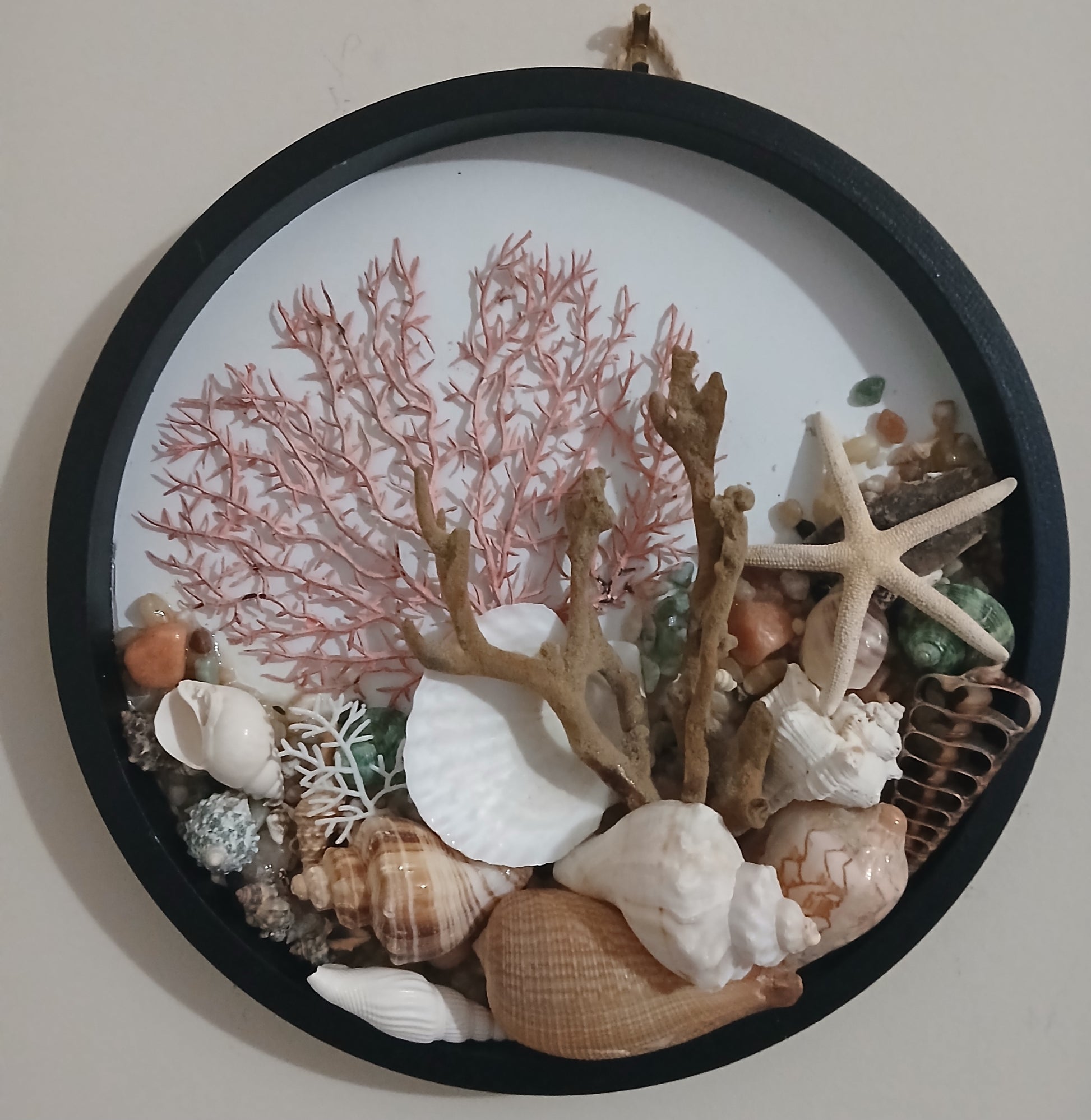 This 12" elegant wall art features a refined composition of seashells, coral, and starfish arranged in a circular frame, making it an ideal piece for a home that cherishes the wonder and beauty of the sea. Its intricate natural textures and forms bring a serene coastal charm to any space.