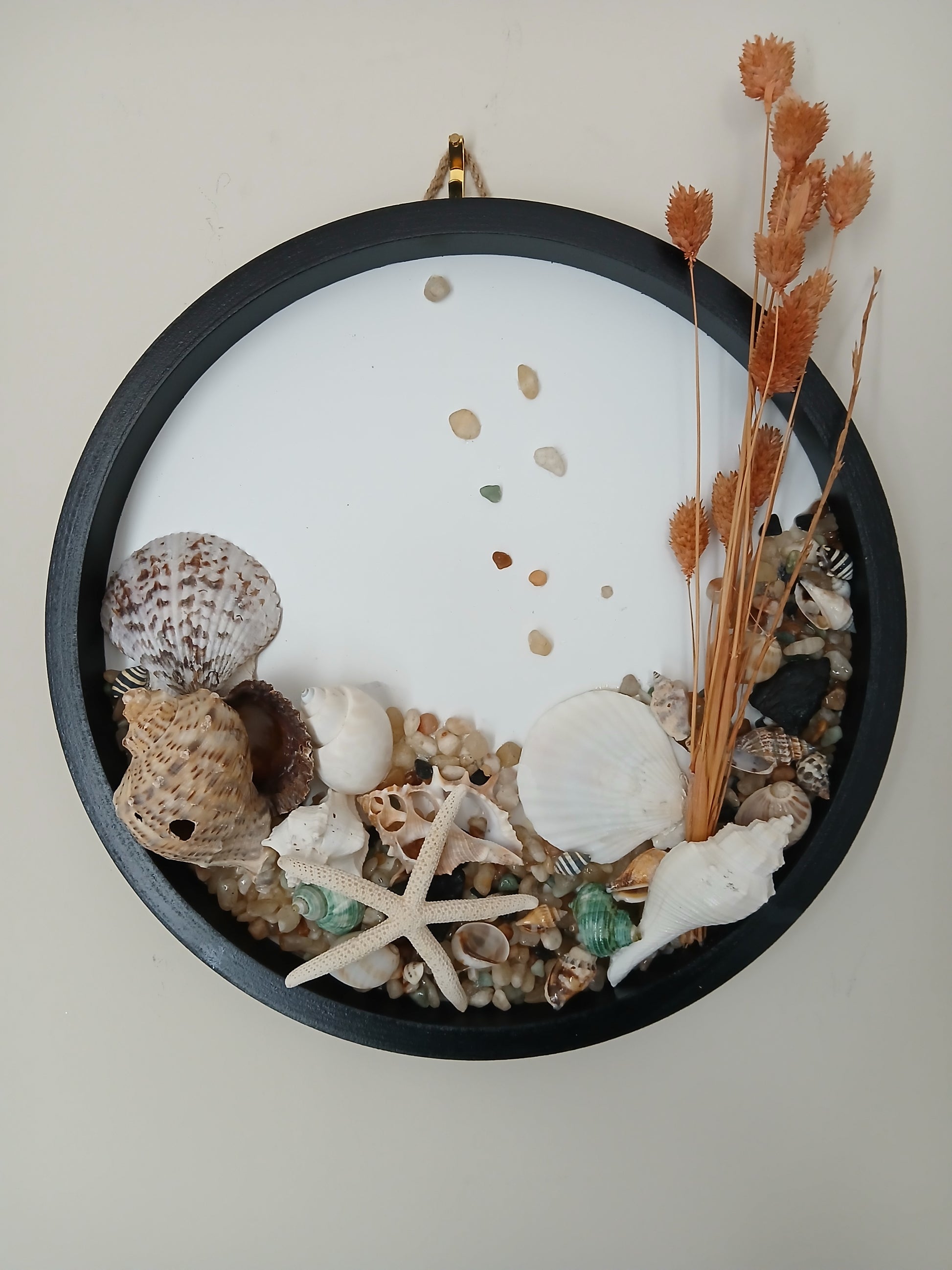 Measuring 12 inches, this exquisite wall art showcases a sophisticated arrangement of seashells, coral, and starfish within a circular frame. Perfect for a home that values the enchanting beauty of the sea, it adds a tranquil coastal elegance through its detailed natural textures and shapes.