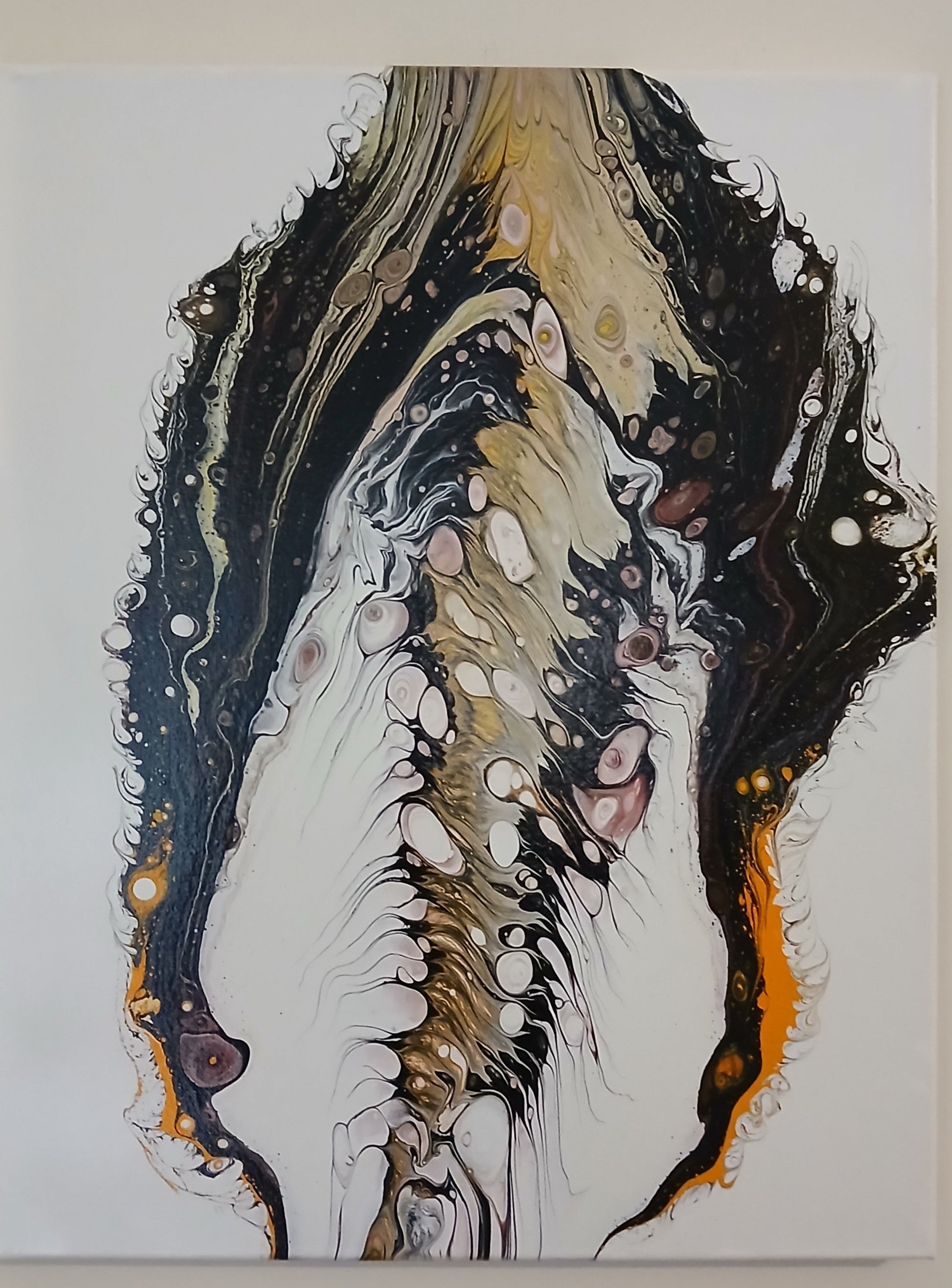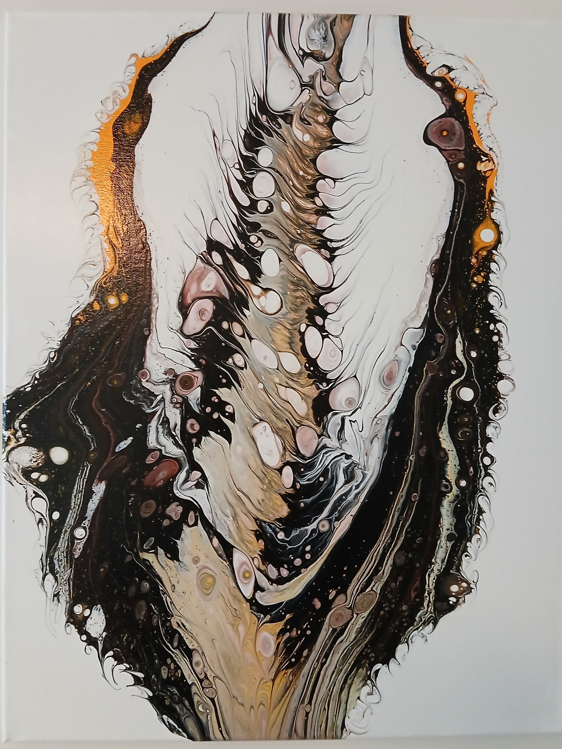 This abstract wall art masterfully blends shades of black, white, gold, and beige to offer a rich and captivating visual experience. The composition suggests a coral-like structure with subtle predatory undertones, evoking a sense of mystery and intrigue. Its delicate yet commanding presence invites viewers to explore the balance between strength and fragility. It is a sophisticated addition to any space seeking depth and artistic expression.