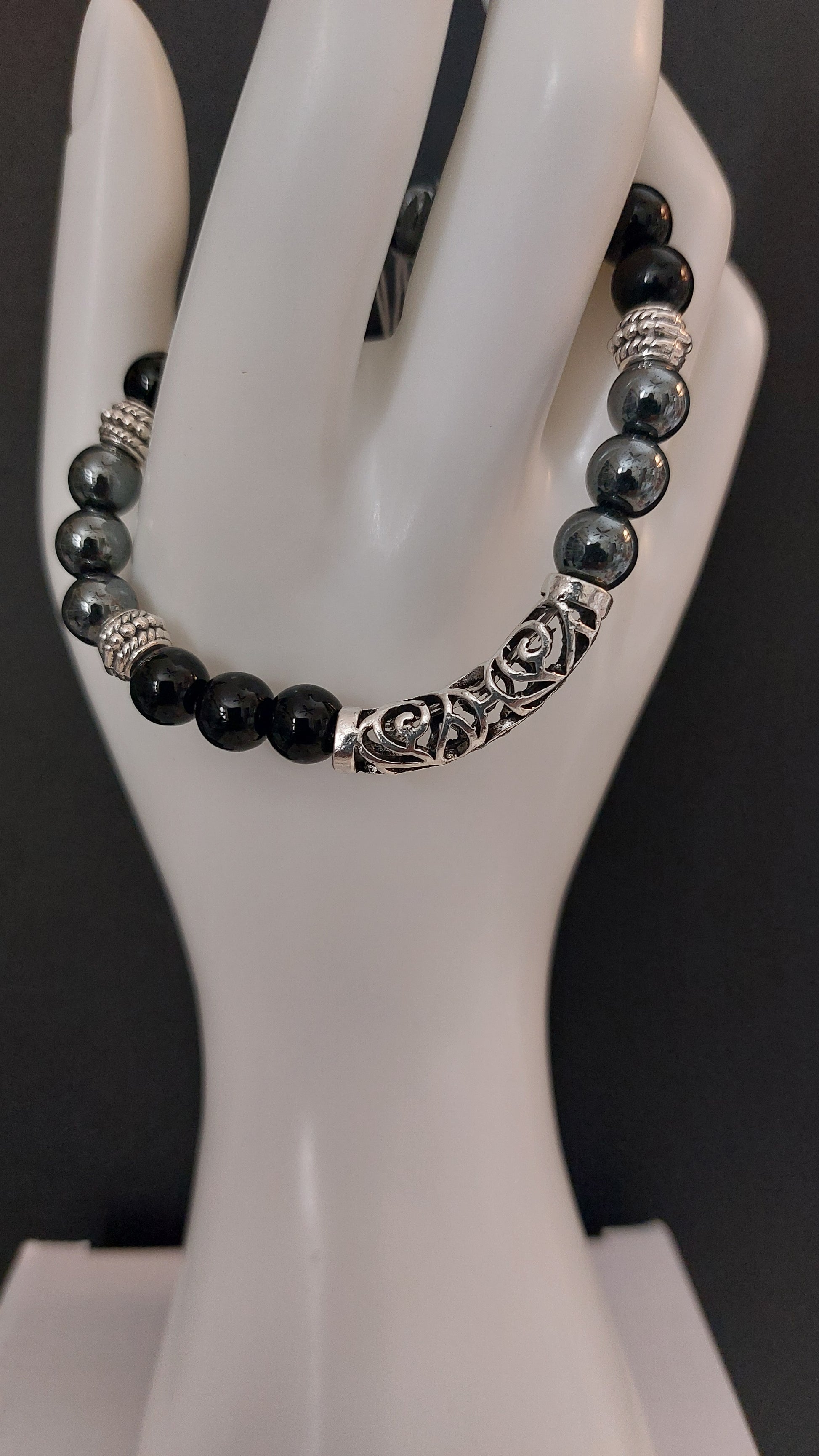 Enhance your look with our intricate circular and tubular metallic spacers. This hematite bracelet s designed for both men and women. Add a touch of luxury and sophistication to any outfit with this versatile and eye-catching accessory. Perfect for elevating your look, day or night.